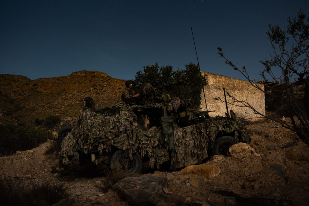 Nachts im Versteck: Ein getarntes Einsatzsystem Luftlandeplattform bezieht Stellung im anspruchsvollen Gelände, die Besatzung beobachtet den Raum