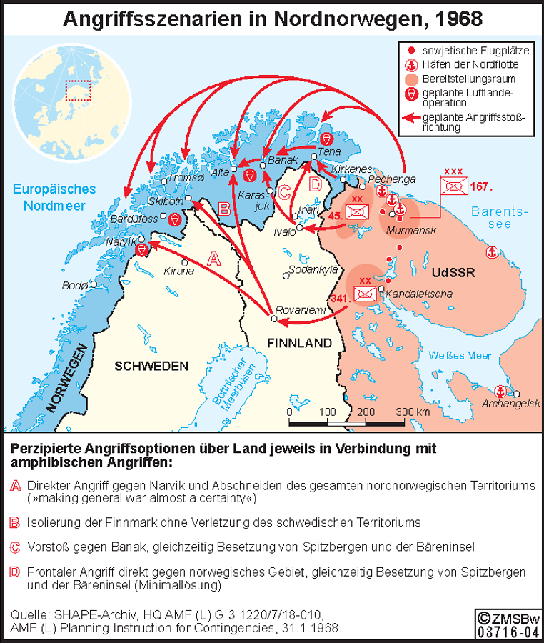 Um die Basen ihrer Atom-U-Boote im Murmansk-Fjord und die Flugplätze der strategischen Bomber auf der Kola-Halbinsel vor Luftangriffen der NATO zu schützen, würde daher die Sowjetunion zu Beginn eines Krieges oder präemptiv versuchen, die norwegische Atlantikküste und die norwegischen Flugplätze in eigene Hände zu bekommen. Die realen damaligen sowjetischen Planungen kennen wir auch heute nicht. Aber wir haben heute Zugang zu den nach Ende des (ersten) Ost-West-Konflikts veröffentlichten Feindlagebeurteilungen der NATO darüber. Die hier abgebildete Karte zeigt die Annahme des Allied Command Europe Mobile Force Anfang 1968.