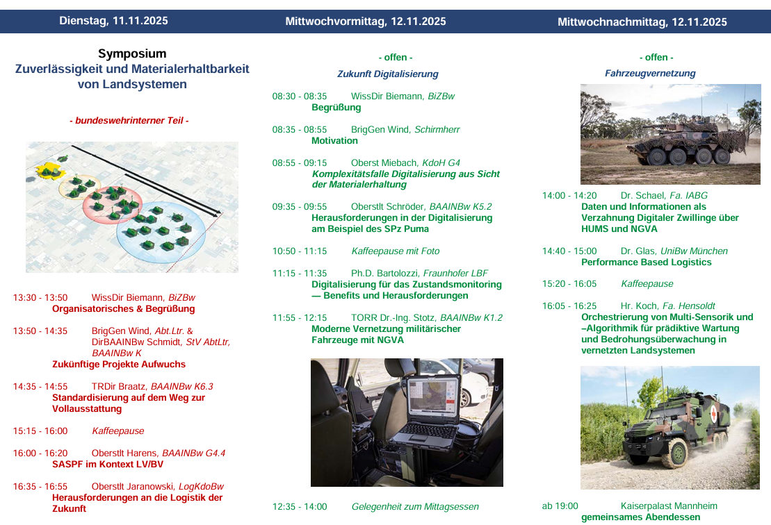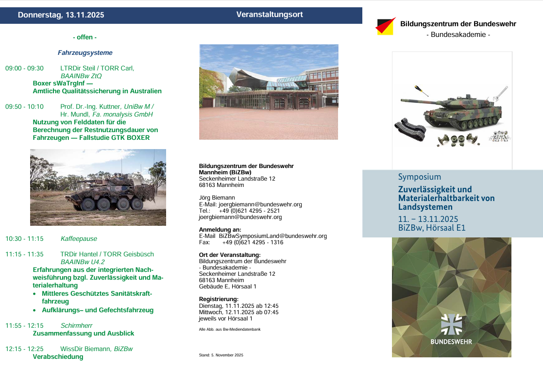Vom 11. bis 13. November 2025 fand nun zum fünften Mal das Symposium „Zuverlässigkeit und Materialerhaltbarkeit von Landsystemen“ am BiZBw (Bildungszentrum der Bundeswehr) in Mannheim statt. Schirmherr der Veranstaltung war wie in den vorherigen Jahren der Abteilungsleiter Kampf im BAAINBw (Bundesamt für Ausrüstung, Infrastruktur und Nutzung der Bundeswehr).
