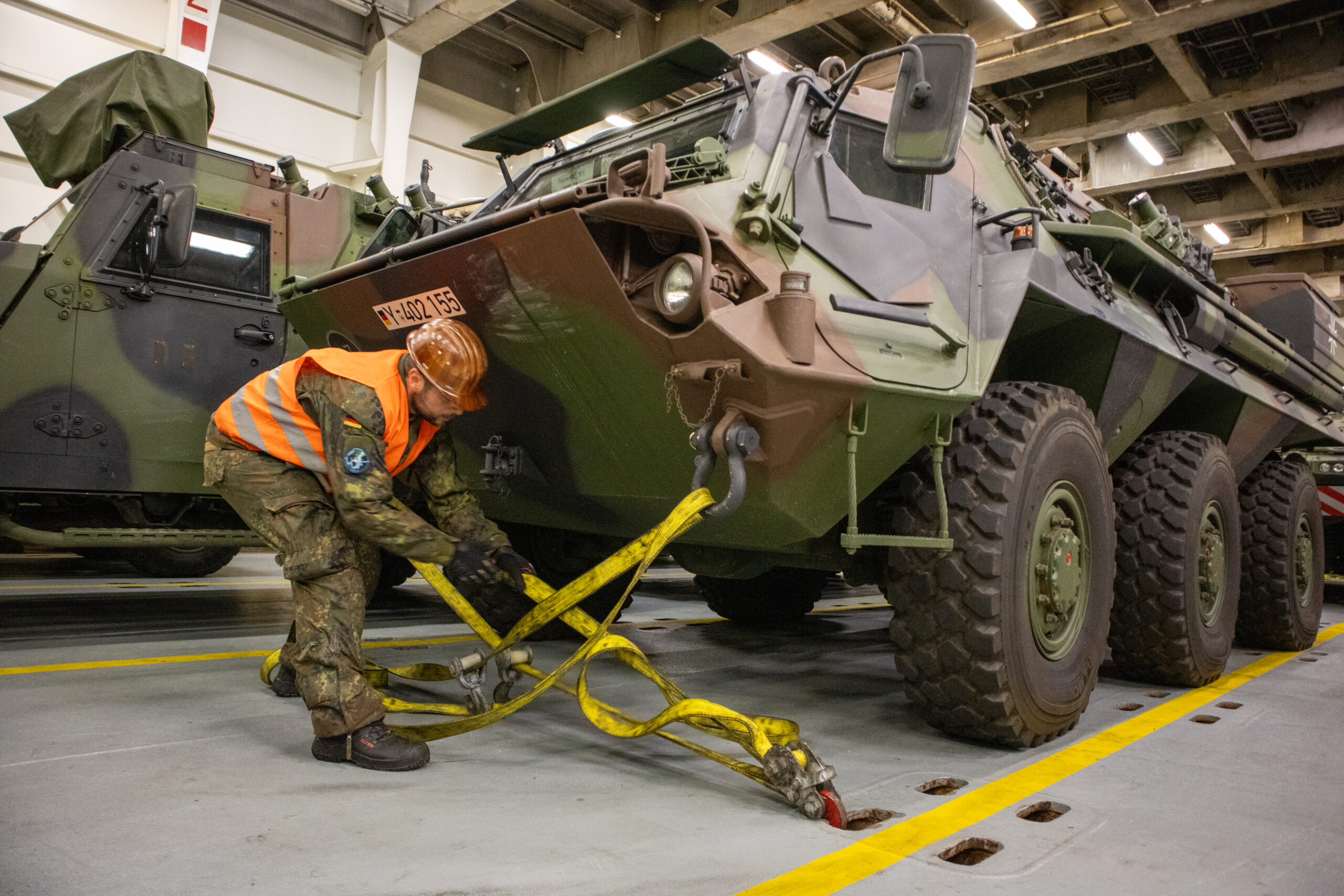 stehen für die Verladung im Hafen von Emden für die Übung Nordic Response im Rahmen der Übungsreihe QUADRIGA am 16.02.2024 bereit.